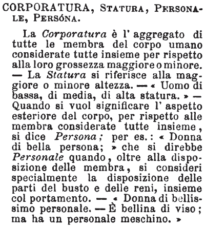 | Corporatura, Statura, Personale, Persona - La Corporatura è l' aggregato di tutte le membra del corpo umano considerate tutte insieme per rispetto alla loro grossezza maggiore o minore. - La Statura si riferisce alla maggiore o minore altezza. - «Uomo di bassa, di media, di alta statura.» - Quando si vuol significare l' aspetto esteriore del corpo, per rispetto alle membra considerate tutte insieme, si dice Persona; per es.: «Donna di bella persona;» che si direbbe Personale quando, oltre alla disposizione delle membra, si consideri specialmente la disposizione delle parti del busto e delle reni, insieme col portamento. - «Donna di bellissimo personale. - E' bellina di viso; ma ha un personale meschino.» [immagine] |