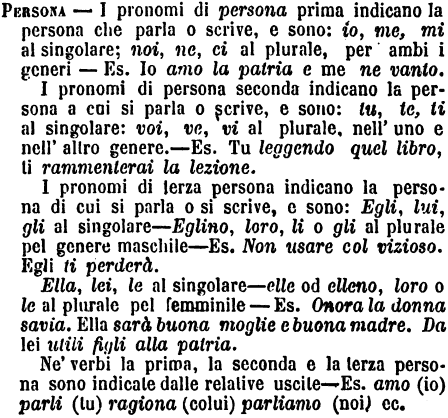 I pronomi di persona seconda indicano la persona a cui si parla o scrive, e sono: tu, te, ti al singolare: voi, ve, vi al plurale, nell'uno e nell'altro genere. - Es. Tu leggendo quel libro, ti rammenterai la lezione. I pronomi di terza persona indicano la persona di cui si parla o si scrive, e sono: Egli, lui, gli al singolare - Eglino, loro, li o gli al plurale pel genere maschile - Es. Non usare col vizioso. Egli ti perderà. Ella, lei, le al singolare - elle od elleno, loro o le al plurale pel femminile - Es. Onora la donna savia. Ella sarà buona moglie e buona madre. Da lei utili figli alla patria. Ne' verbi la prima, la seconda e la terza persona sono indicate dalle relative uscite - Es. amo (io) parli (tu) ragiona (colui) parliamo (noi) ec. [immagine] |