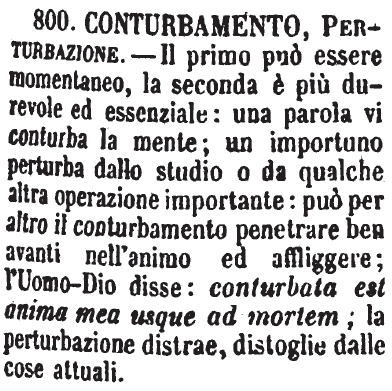 | Conturbamento, Perturbazione - Il primo può essere momentaneo, la seconda è più durevole ed essenziale: una parola vi conturba la mente; un importuno perturba dallo studio o da qualche altra operazione importante: può per altro il conturbamento penetrare ben avanti nell'animo ed affliggere; l'Uomo-Dio disse: conturbata est anima mea usque ad mortem; la perturbazione distrae, distoglie dalle cose attuali. [immagine] |