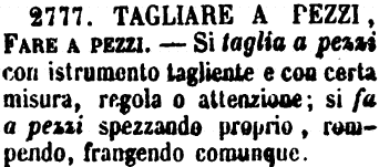 Tagliare a pezzi, Fare a pezzi - Si taglia a pezzi con istrumento tagliente e con certa misura, regola o attenzione; si fa a pezzi spezzando proprio, rompendo, frangendo comunque. [immagine]