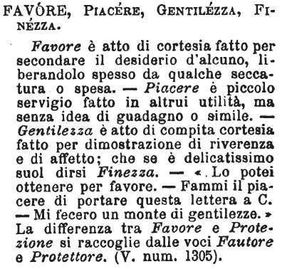 Favore, Piacere, Gentilezza, Finezza - Favore è atto di cortesia fatto per secondare il desiderio d'alcuno, liberandolo spesso da qualche seccatura o spesa. - Piacere è piccolo servigio fatto in altrui utilità, ma senza idea di guadagno o simile. - Gentilezza è atto di compita cortesia fatto per dimostrazione di riverenza e di affetto; che se è delicatissimo suol dirsi Finezza. - «Lo potei ottenere per favore. - Fammi il piacere di portare questa lettera a C. - Mi fecero un monte di gentilezze.» La differenza tra Favore e Protezione si raccoglie dalle voci Fautore e Protettore. (V. num. 1305). [immagine]