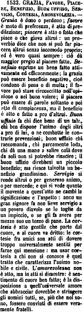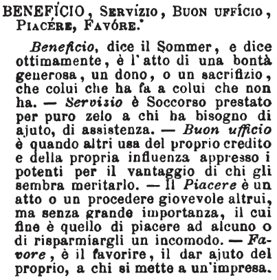 Beneficio, Servizio, Buon ufficio, Piacere, Favore - Beneficio, dice il Sommer, e dice ottimamente, è l'atto di una bontà generosa, un dono, o un sacrifizio, che colui che ha fa a colui che non ha. - Servizio è Soccorso prestato per puro zelo a chi ha bisogno di ajuto, di assistenza. - Buon ufficio è quando altri usa del proprio credito e della propria influenza appresso i potenti per il vantaggio di chi gli sembra meritarlo. - Il Piacere è un atto o un procedere giovevole altrui, ma senza grande importanza, il cui fine è quello di piacere ad alcuno o di risparmiargli un incomodo. - Favore, è il favorire, il dar ajuto del proprio, a chi si mette a un'impresa. [immagine]