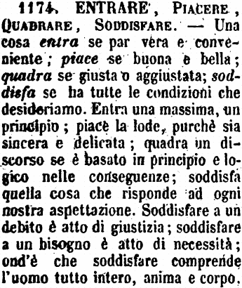 Entrare, Piacere, Quadrare, Soddisfare - Una cosa entra se par vera e conveniente; piace se buona e bella; quadra se giusta o aggiustata; soddisfa se ha tutte le condizioni che desideriamo. Entra una massima, un principio; piace la lode, purchè sia sincera e delicata; quadra un discorso se è basato in principio e logico nelle conseguenze; soddisfa quella cosa che risponde ad ogni nostra aspettazione. Soddisfare a un debito è atto di giustizia; soddisfare a un bisogno è atto di necessità; ond'è che soddisfare comprende l'uomo tutto intero, anima e corpo. [immagine]