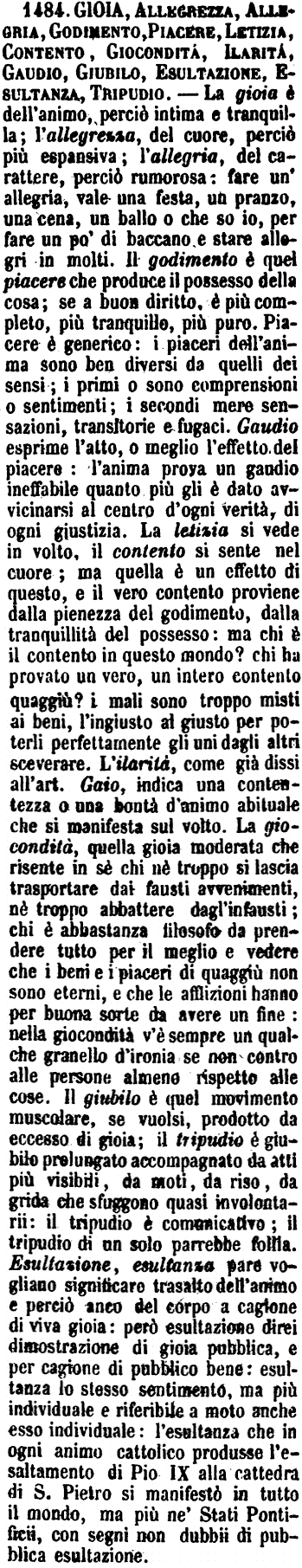 Gioia, Allegrezza, Allegria, Godimento, Piacere, Letizia, Contento, Giocondità, Ilarità, Gaudio, Giubilo, Esultazione, Esultanza, Tripudio - La gioia è dell'animo, perciò intima e tranquilla; l'allegrezza, del cuore, perciò più espansiva; l'allegria, del carattere, perciò rumorosa: fare un'allegria, vale una festa, un pranzo, una cena, un ballo o che so io, per fare un po' di baccano e stare allegri in molti. Il godimento è quel piacere che produce il possesso della cosa; se a buon diritto, è più completo, più tranquillo, più puro. Piacere è generico: i piaceri dell'anima sono ben diversi da quelli dei sensi; i primi o sono comprensioni o sentimenti; i secondi mere sensazioni, transitorie e fugaci. Gaudio esprime l'atto, o meglio l'effetto del piacere: l'anima prova un gaudio ineffabile quanto più gli è dato avvicinarsi al centro d'ogni verità, di ogni giustizia. La letizia si vede in volto, il contento si sente nel cuore; ma quella è un effetto di questo, e il vero contento proviene dalla pienezza del godimento, dalla tranquillità del possesso: ma chi è il contento in questo mondo? chi ha provato un vero, un intero contento quaggiù? i mali sono troppo misti ai beni, l'ingiusto al giusto per poterli perfettamente gli uni dagli altri sceverare. L'ilarità, come già dissi all'art. Gaio, indica una contentezza o una bontà d'animo abituale che si manifesta sul volto. La giocondità, quella gioia moderata che risente in sè chi nè troppo si lascia trasportare dai fausti avvenimenti, nè troppo abbattere dagl'infausti; chi è abbastanza filosofo da prendere tutto per il meglio e vedere che i beni e i piaceri di quaggiù non sono eterni, e che le afflizioni hanno per buona sorte da avere un fine: nella giocondità v'è sempre un qualche granello d'ironia se non contro alle persone almeno rispetto alle cose. Il giubilo è quel movimento muscolare, se vuolsi, prodotto da eccesso di gioia; il tripudio è giubilo prolungato accompagnato da atti più visibili, da moti, da riso, da grida che sfuggono quasi involontarii: il tripudio è comunicativo; il tripudio di un solo parrebbe follia. Esultazione, esultanza pare vogliano significare trasalto dell'animo e perciò anco del corpo a cagione di viva gioia: però esultazione direi dimostrazione di gioia pubblica, e per cagione di pubblico bene: esultanza lo stesso sentimento, ma più individuale e riferibile a moto anche esso individuale: l'esultanza che in ogni animo cattolico produsse l'esaltamento di Pio IX alla cattedra di S. Pietro si manifestò in tutto il mondo, ma più ne' Stati Pontificii, con segni non dubbii di pubblica esultazione. [immagine]