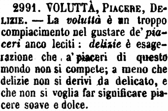 Voluttà, Piacere, Delizie - La voluttà è un troppo compiacimento nel gustare de' piaceri anco leciti: delizie è esagerazione che a' piaceri di questo mondo non si compete; a meno che delizie non si derivi da delicato, e che non si voglia far significare piacere soave e dolce. [immagine]