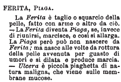 Ferita, Piaga - La Ferita è taglio o squarcio della pelle, fatto con arme o altro da ciò. - La Ferita diventa Piaga, se, invece di riunirsi, marcisce, e così si allarga. La Piaga però può non nascere da Ferita; ma nasce alle volte da rottura della pelle avvenuta per guasto di umori e si dilata e produce marcia. - Ulcera è piccola piaghetta di natura maligna, che viene sulle membrane mucose. [immagine]
