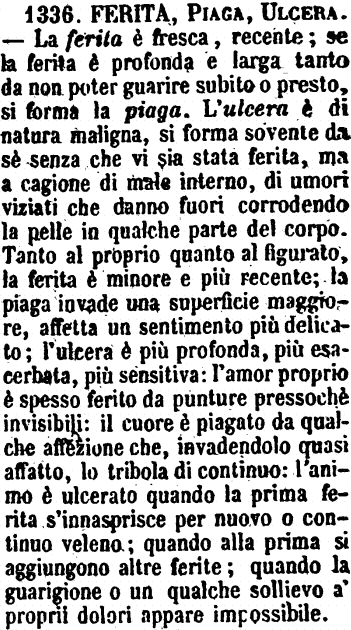 Ferita, Piaga, Ulcera - La ferita è fresca, recente; se la ferita è profonda e larga tanto da non poter guarire subito o presto, si forma la piaga. L'ulcera è di natura maligna, si forma sovente da sè senza che vi sia stata ferita, ma a cagione di male interno, di umori viziati che danno fuori corrodendo la pelle in qualche parte del corpo. Tanto al proprio quanto al figurato, la ferita è minore e più recente; la piaga invade una superficie maggiore, affetta un sentimento più delicato; l'ulcera è più profonda, più esacerbata, più sensitiva: l'amor proprio è spesso ferito da punture pressochè invisibili: il cuore è piagato da qualche affezione che, invadendolo quasi affatto, lo tribola di continuo: l'animo è ulcerato quando la prima ferita s'innasprisce per nuovo o continuo veleno; quando alla prima si aggiungono altre ferite; quando la guarigione o un qualche sollievo a' proprii dolori appare impossibile. [immagine]