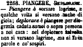 | Piangere, Deplorare - Piangere è versare lagrime, e qualche volta si versano anche di gioia; deplorare è piangere per disgrazia caduta su noi o sopra persona a noi cara: nel deplorare talvolta non si versano lagrime, ma si fa in parole e co' sospiri. [immagine] |