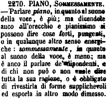 | Piano, Sommessamente - Parlare piano, in quanto al suono della voce, è più; ma dicendole anco all'orecchio e pianissimo si possono dire cose forti, pungenti, o in qualunque altro senso energiche: sommessamente, in quanto al suono della voce, è meno; ma è anco il parlare de' dipendenti, e di chi non può o non vuole dire tutta la sua ragione, o è obbligato di rivestirla di forme supplichevoli ed esporla in altro modo dimesso. [immagine] |