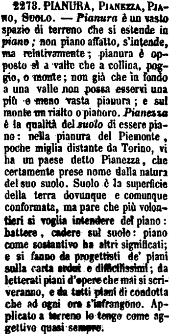 | Pianura, Pianezza, Piano, Suolo - Pianura è un vasto spazio di terreno che si estende in piano; non piano affatto, s'intende, ma relativamente; pianura è opposto sì a valle che a collina, poggio, o monte; non già che in fondo a una valle non possa esservi una più o meno vasta pianura; e sul monte un rialto o pianoro. Pianezza è la qualità del suolo d essere piano: nella pianura del Piemonte, poche miglia distante da Torino, vi ha un paese detto Pianezza, che certamente prese nome dalla natura del suo suolo. Suolo è la superficie della terra dovunque e comunque conformata, ma pare che più volontieri si voglia intendere del piano: battere, cadere sul suolo: piano come sostantivo ha altri significati; e si fanno da progettisti de' piani sulla carta ardui e difficilissimi; da letterati piani d'opere che mai si scriveranno, e da tutti piani di condotta che ad ogni ora s'infrangono. Applicato a terreno lo tengo come aggettivo quasi sempre. [immagine] |