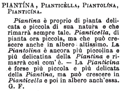 Piantina, Pianticella, Piantolina, Pianticina - Piantina è proprio di pianta delicata e piccola di sua natura e che rimarrà sempre tale. Pianticella, di pianta ora piccola, ma che può cresccere anche in albero altissimo. La Piantolina è ancora più piccolina e più delicatina della Piantina e rimarrà così com'è. - La Pianticina è forse più piccola e più delicata della Piantina, ma può crescere in Pianticella e poi in albero anch'essa. G. F. [immagine]