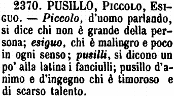 | Pusillo, Piccolo, Esiguo - Piccolo, d'uomo parlando, si dice chi non è grande della persona; esiguo, chi è malingro e poco in ogni senso; pusilli, si dicono un po' alla latina i fanciulli; pusillo d'animo e d'ingegno chi è timoroso e di scarso talento. [immagine] |