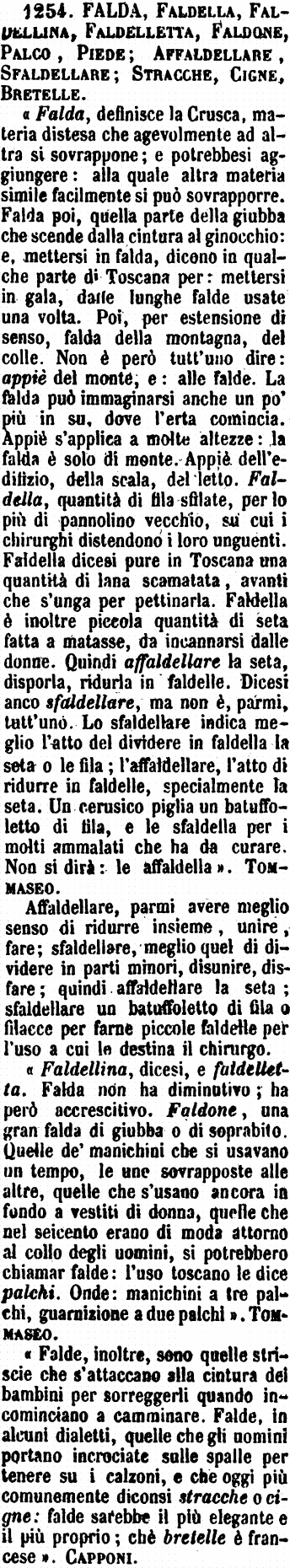 | Falda, Faldella, Faldellina, Faldelletta, Faldone, Palco, Piede; Affaldellare, Sfaldellare; Stracche, Cigne, Bretelle - « Falda, definisce la Crusca, materia distesa che agevolmente ad altra si sovrappone; e potrebbesi aggiungere: alla quale altra materia simile facilmente si può sovrapporre. Falda poi, quella parte della giubba che scende dalla cintura al ginocchio: e, mettersi in falda, dicono in qualche parte di Toscana per: mettersi in gala, dalle lunghe falde usate una volta. Poi, per estensione di senso, falda della montagna, del colle. Non è però tutt'uno dire: appiè del monte, e: alle falde. La falda può immaginarsi anche un po' più in su, dove l'erta comincia. Appiè s'applica a molte altezze: la falda è solo di monte. Appiè dell'edifizio, della scala, del letto. Faldella, quantità di fila sfilate, per lo più di pannolino vecchio, su cui i chirurghi distendono i loro unguenti. Faldella dicesi pure in Toscana una quantità di lana scamatata, avanti che s'unga per pettinarla. Faldella è inoltre piccola quantità di seta fatta a matasse, da incannarsi dalle donne. Quindi affaldellare la seta, disporla, ridurla in faldelle. Dicesi anco sfaldellare, ma non è, parmi, tutt'uno. Lo sfaldellare indica meglio l'atto del dividere in faldella la seta o le fila; l'affaldellare, l'atto di ridurre in faldelle, specialmente la seta. Un cerusico piglia un batuffoletto di fila, e le sfaldella per i molti ammalati che ha da curare. Non si dirà: le affaldella ». Tommaseo.