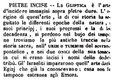| Pietre incise - La Gliptica è l'arte d'incidere immagini sopra pietre dure. L'origine di quest'arte, la di cui storia ha seguitato le differenti epoche della natura, i suoi principj, i suoi progressi e la di lei decadenza, si perdono nel bujo dei tempi: ne troviamo le più antiche traccie nella storia sacra, nell'urim e tummim del sovrano pontefice, e nei due onici della sua tonaca in cui si erano incisi i nomi delle dodici tribù. Gl'Israeliti impararono quell'arte dagli Egizj che già la conoscevano; essa non fu tampoco estranea agli Etiopj. [immagine] |