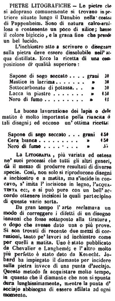 | Pietre litografiche - Le pietre che si adoprano comunemente si trovano in petriere situate lungo il Danubio nella contea di Pappenheim. Sono di natura calco-arzillosa e contenente un poco di silice; hanno il colore bigiccio, e la grana fine che prende un bel lucido.