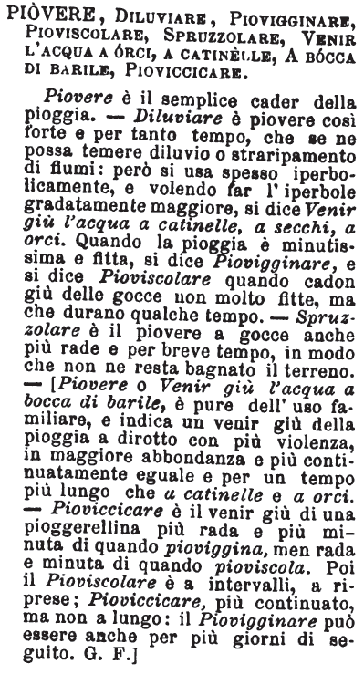 Piovere, Diluviare, Piovigginare, Pioviscolare, Spruzzolare, Venir l’acqua a orci, A catinelle, A bocca di barile, Pioviccicare - Piovere è il semplice cader della pioggia. - Diluviare è piovere così forte e per tanto tempo, che se ne possa temere diluvio o straripamento di fiumi: però si usa spesso iperbolicamente, e volendo far l’iperbole gradatamente maggiore, si dice Venir giù l’acqua a catinelle, a secchi, a orci. Quando la pioggia è minutissima e fitta, si dice Piovigginare, e si dice Pioviscolare quando cadon giù delle gocce non molto fitte, ma che durano qualche tempo. - Spruzzolare è il piovere a gocce anche più rade e per breve tempo, in modo che non ne resta bagnato il terreno. – [Piovere o Venir giù l’acqua a bocca di barile, è pure dell’uso familiare, e indica un venir giù della pioggia a dirotto con più violenza, in maggior abbondanza e più continuatamente eguale e per un tempo più lungo che a catinelle e a orci. - Pioviccicare è il venir giù di una pioggerellina più rada e più minuta di quando pioviggina, men rada e minuta di quando pioviscola. Poi il Pioviscolare è a intervalli, a riprese; Pioviccicare, più continuato, ma non a lungo: il Piovigginare può essere anche per più giorni di seguito. G. F.] [immagine]