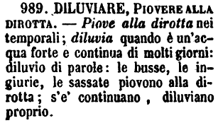 Diluviare, Piovere alla dirotta - Piove alla dirotta nei temporali; diluvia quando è un'acqua forte e continua di molti giorni: diluvio di parole: le busse, le ingiurie, le sassate piovono alla dirotta; s'e' continuano, diluviano proprio. [immagine]