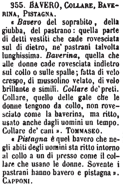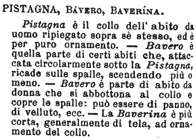 Bavero, Collare, Baverina, Pistagna - «Bavero del soprabito, della giubba, del pastrano: quella parte di detti vestiti che cade rovesciata sul di dietro, ne' pastrani talvolta lunghissima. Baverina, quella che alle donne cade rovesciata indietro sul collo o sulle spalle; fatta di velo crespo, di mussolino velato, di velo brillante e simili. Collare de' preti. Collare, quello delle gale che le donne tengono da collo, non rovesciato come la baverina, ma ritto, usato anche dagli uomini un tempo. Collare de' cani». Tommaseo.