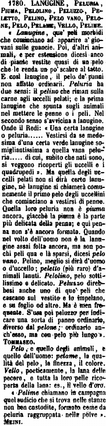 Lanugine, Peluria, Piuma, Pelolino, Peluzzo, Peletto, Pelino, Pelo vano, Pelone, Pelo, Pelame; Vello, Pelime - «Lanugine, que' peli morbidi che cominciano ad apparire a' giovani sulle guancie. Poi, d'altri animali, e per estensione dicesi anco di piante vestite quasi di un pelo che le renda un po' scabre al tatto. E così lanugine, il pelo de' panni non affatto ordinarii. Peluria ha due sensi: il pelino che riman sulla carne agli uccelli pelati; e la prima lanugine che spunta sugli animali nel mettere le penne o i peli. Nel secondo senso s'avvicina a lanugine. Onde il Redi: «Una certa lanugine o peluria ...... Vestirsi da se medesima d'una certa verde lanugine somigliantissima a quella vana peluria..... di cui, subito che nati sono, si veggono ricoperti gli uccelli e i quadrupedi». Ma quella degli uccelli pelati non si dirà certo lanugine, nè lanugine si chiamerà comunemente il primo pelo degli uccellini che cominciano a vestirsi di penne. Quella loro peluria non è piuma ancora, giacchè la piuma è la parte più delicata della penna; e qui penna non s'è ancora formata. Quando nel volto dell'uomo non è la lanugine assai folta ancora, ma son pochi peli qua e là sparsi, dicesi pelo vano. Pelino, meglio si dirà d'uomo o d'uccello; peletto (più raro) d'animali lanuti. Pelolino, pelo sottilissimo e delicato. Peluzzo direbbesi anche uno di que' peli che cascano sul vestito e lo impelano, e su foglio od altro. Ma è men frequente. S'usa poi peluzzo per indicare una sorta di panno ordinario, diverso dal pelone; ordinario anch'esso, ma con pelo più lungo». Tommaseo.