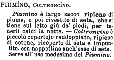 Piumino, Coltroncino - Piumino è largo sacco ripieno di piuma, e poi rivestito di seta, che si tiene sul letto giù da' piedi, per tenerli caldi la notte. - Coltroncino è piccolo copertojo raddoppiato, ripieno di cotone, ricoperto di seta e impuntito, con nappettine anch'esse di seta. Serve all'uso medesimo del Piumino. [immagine]