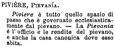 | Piviere, Pievania - Piviere è tutto quello spazio di paese che è governato ecclesiasticamente dal pievano. - La Pievania è l'ufficio e le rendite del pievano, e anche la casa canonica dove esso abita. [immagine] |