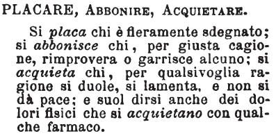 | Placare, Abbonire, Acquietare - Si placa chi è fieramente sdegnato; si abbonisce chi, per giusta cagione, rimprovera o garrisce alcuno; si acquieta chi, per qualsivoglia ragione si duole, si lamenta e non si dà pace; e suol dirsi anche dei dolori fisici che si acquietano con qualche farmaco. [immagine] |