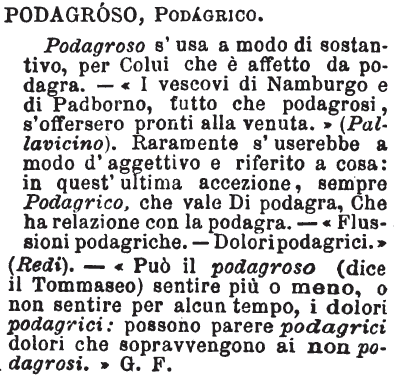 | Podagroso, Podagrico - Podagroso s'usa a modo di sostantivo, per Colui che è affetto da podagra. - «I vescovi di Namburgo e di Padborno, tutto che podagrosi, s'offersero pronti alla venuta.» (Pallavicino). Raramente s'userebbe a modo d'aggettivo e riferito a cosa: in quest'ultima accezione, sempre Podagrico, che vale Di podagra, Che ha relazione con la podagra. - «Flussioni podagriche. - Dolori podagrici.» (Redi). - «Può il podagroso (dice il Tommaseo) sentire più o meno, o non sentire per alcun tempo, i dolori podagrici: possono parere podagrici dolori che sopravvengono ai non podagrosi.» G. F. [immagine] |