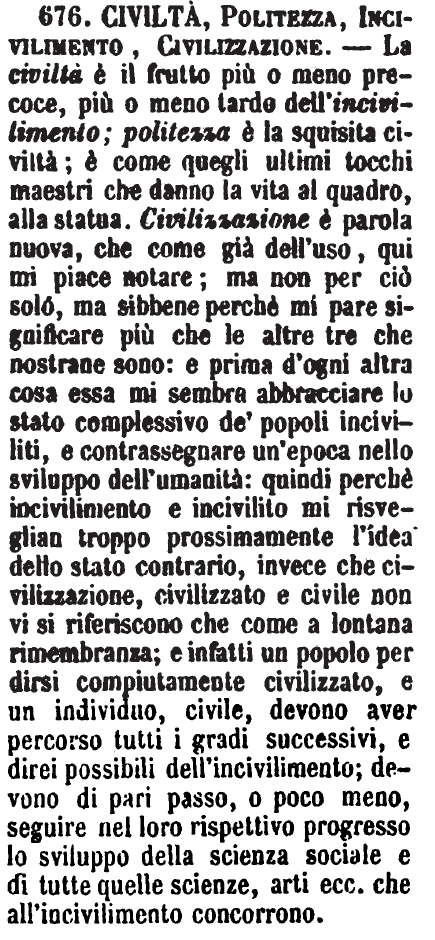 | Civiltà, Politezza, Incivilimento, Civilizzazione - La civiltà è il frutto più o meno precoce, più o meno tardo dell'incivilimento; politezza è la squisita civiltà; è come quegli ultimi tocchi maestri che danno la vita al quadro, alla statua. Civilizzazione è parola nuova, che come già dell'uso, qui mi piace notare; ma non per ciò solo, ma sibbene perchè mi pare significare più che le altre tre che nostrane sono: e prima d'ogni altra cosa essa mi sembra abbracciare lo stato complessivo de' popoli inciviliti, e contrassegnare un'epoca nello sviluppo dell'umanità: quindi perchè incivilimento e incivilito mi risveglian troppo prossimamente l'idea dello stato contrario, invece che civilizzazione, civilizzato e civile non vi si riferiscono che come lontana rimembranza; e infatti un popolo per dirsi compiutamente civilizzato, e un individuo, civile, devono aver percorso tutti i gradi successivi, e direi possibili dell'incivilimento; devono di pari passo, o poco meno, seguire nel loro rispettivo progresso lo sviluppo della scienza sociale e di tutte quelle scienze, arti ecc. che all'incivilimento concorrono. [immagine] |