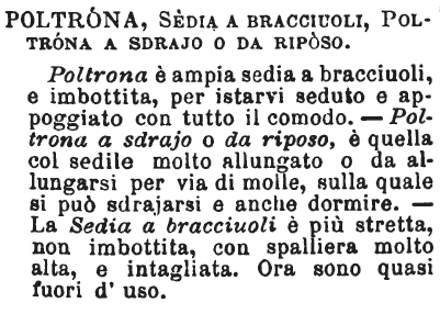 | Poltrona, Sedia a Bracciuoli, Poltrona a sdrajo o da riposo - Poltrona è ampia sedia a bracciuoli, e imbottita, per istarvi seduto e appoggiato con tutto il comodo. - Poltrona a sdrajo o da riposo, è quella col sedile molto allungato o da allungarsi per via di molle, sulla quale si può sdrajarsi e anche dormire. - La Sedia a bracciuoli è più stretta, non imbottita, con spalliera molto alta, e intagliata. Ora sono quasi fuori d'uso. [immagine] |