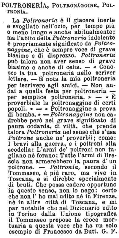 | Poltroneria, Poltronaggine, Poltrona - La Poltroneria è il giacere inerte e svogliato nell'ozio, per tempo più o meno lungo e anche abitualmente; ma l'abito della Poltroneria indolente è propriamente significato da Poltronaggine, che è sempre voce di grave biasimo e di disprezzo. Poltroneria può talora non aver senso di grave biasimo e anche di celia. - « Conosco la tua poltroneria nello scriver lettere. - E' nota la mia poltroneria per iscrivere agli amici. - Non andai a quella festa per poltroneria - per semplice poltroneria. » - « E' proverbiale la poltronaggine di certi popoli. » - « Poltronaggine a prova di bomba. » - Poltronaggine non cadrebbe però nel grave significato di paura codarda, di viltà, che prende talora Poltroneria nel senso che s'usa Poltrone anche ne' proverbii; come: I bravi alla guerra, e i poltroni alla scodella; L'armi de' poltroni non tagliano nè forano; Tutte l'armi di Brescia non armerebbero la paura d'un poltrone. - Poltronía, secondo il Tommaseo, è più raro, ma vive in Toscana, e si direbbe specialmente di bruti. Che possa cadere opportuno in questo senso, non lo nego: certo che non l'ho mai udito nè in Firenze, nè in altre città di Toscana, e mi par notabile che nel Dizionario edito in Torino dalla Unione tipografica il Tommaseo prepose la croce mortuaria a questa voce che ha un solo esempio di Francesco da Buti. G. F. [immagine] |