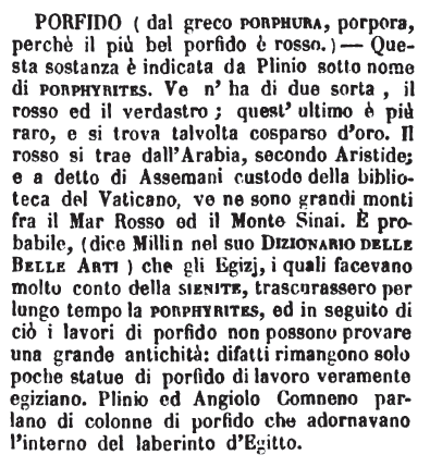 | Porfido - (dal greco porphura, porpora, perchè il più bel porfido è rosso.) - Questa sostanza è indicata da Plinio sotto nome di porphyrites. Ve n'ha di due sorta, il rosso ed il verdastro; quest'ultimo è più raro, e si trova talvolta cosparso d'oro. Il rosso si trae dall'Arabia, secondo Aristide; e a detto di Assemani custode della biblioteca del Vaticano, ve ne sono grandi monti fra il Mar Rosso ed il Monte Sinai. E' probabile, (dice Millin nel suo Dizionario delle Belle Arti) che gli Egizj, i quali facevano molto conto della sienite, trascurassero per lungo tempo la porphyrites, ed in seguito di ciò i lavori di porfido non possono provare una grande antichità: difatti rimangono solo poche statue di porfido di lavoro veramente egiziano. Plinio ed Angiolo Comneno parlano di colonne di porfido che adornavano l'interno del laberinto d'Egitto. [immagine] |