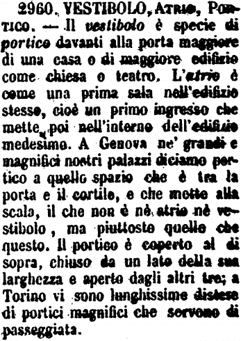 | Vestibolo, Atrio, Portico - Il vestibolo è specie di portico davanti alla porta maggiore di una casa o di maggiore edifizio come chiesa o teatro. L'atrio è come una prima sala nell'edifizio stesso, cioè un primo ingresso che mette poi nell'interno dell'edifizio medesimo. A Genova ne' grandi e magnifici nostri palazzi diciamo portico a quello spazio che è tra la porta e il cortile, e che mette alla scala, il che non è nè atrio nè vestibolo, ma piuttosto quello che questo. Il portico è coperto al di sopra, chiuso da un lato della sua larghezza e aperto dagli altri tre; a Torino vi sono lunghissime distese di portici magnifici che servono di passeggiata. [immagine] |