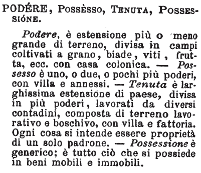 | Podere, Possesso, Tenuta, Possessione - Podere, è estensione più o meno grande di terreno, divisa in campi coltivati a grano, biade, viti, frutta, ecc. con casa colonica. - Possesso è uno, o due, o pochi più poderi, con villa e annessi. - Tenuta è larghissima estensione di paese, divisa in più poderi, lavorati da diversi contadini, composta di terreno lavorativo e boschivo, con villa e fattoria. Ogni cosa si intende essere proprietà di un solo padrone. - Possessione è generico; è tutto ciò che si possiede in beni mobili e immobili. [immagine] |
