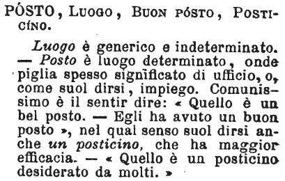 Posto, Luogo, Buon posto, Posticino - Luogo è generico e indeterminato. - Posto è luogo determinato, onde piglia spesso significato di ufficio, o, come suol dirsi, impiego. Comunissimo è il sentir dire: « Quello è un bel posto. - Egli ha avuto un buon posto », nel qual senso suol dirsi anche un posticino, che ha maggior efficacia. - « Quello è un posticino desiderato da molti. » [immagine]