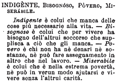 Indigente, Bisognoso, Povero, Miserabile - Indigente è colui che manca delle cose più necessarie alla vita. - Bisognoso è colui che per vivere ha bisogno dell'altrui soccorso che supplisca a ciò che gli manca. -Povero è chi non ha né denari né sostanze, né può fare assegnamento in altro che nel lavoro. - Miserabile è colui che è nella estrema povertà, né può in verun modo ajutarsi e vivere senza l'altrui carità. [immagine]