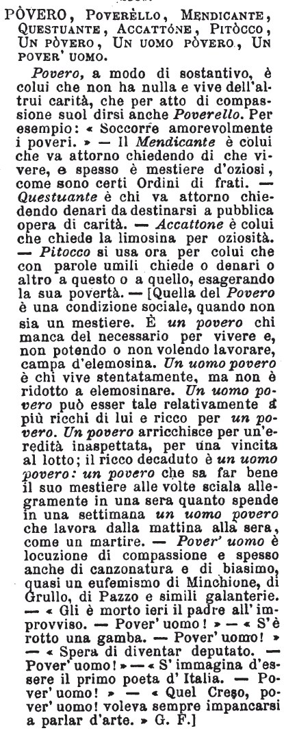 Povero uomo, Un povero, Uomo povero, Autor povero, Povero autore - Pover'uomo è voce d'ironia o di compassione; uomo povero non dice più che quanto chiaramente significa, e s'intende ordinariamente per chi è mancante di beni di fortuna; ma vi sono degli uomini poveri di spirito, di grazia, di prestanza; e questa è povertà assoluta o relativa secondo i casi e anche secondo la condizione e le altre qualità dell'individuo. Per un povero intendiamo sempre un mendico; uno di quei poveri che fanno mostra e commercio della loro povertà accattando per Dio; piaga finora incurabile delle società moderne. Un autor povero, quello che è nelle strettezze, abbia o no genio e scienza; un povero autore, chi ha dato troppo misero saggio di sè in qualche opera per lui pubblicata, sia egli ricco o povero: col primo s'accenna alle sostanze, col secondo ai mezzi intellettuali. [immagine]