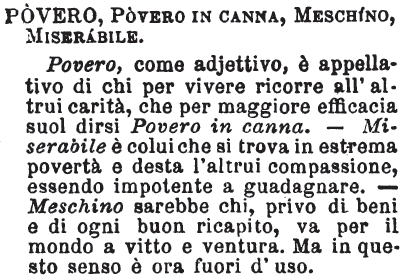 Povero, Povero in canna, Meschino, Miserabile - Povero, come adjettivo, è appellativo di chi per vivere ricorre all'altrui carità, che per maggiore efficacia suol dirsi Povero in canna. - Miserabile è colui che si trova in estrema povertà e desta l'altrui compassione, essendo impotente a guadagnare. - Meschino sarebbe chi, privo di beni e di ogni buon ricapito, va per il mondo a vitto e ventura. Ma in questo senso è ora fuori d'uso. [immagine]