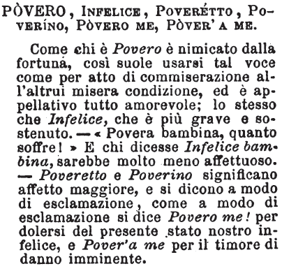 Povero, Infelice, Poveretto, Poverino, Povero me, Pover’ a me - Come chi è Povero è nimicato dalla fortuna, così suole usarsi tal voce come per atto di commiserazione all'altrui misera condizione, ed è appellativo tutto amorevole; lo stesso che Infelice, che è più grave e sostenuto. - «Povera bambina, quanto soffre!» E chi dicesse Infelice bambina, sarebbe molto meno affettuoso. - Poveretto e Poverino significano affetto maggiore, e si dicono a modo di esclamazione, come a modo di esclamazione si dice Povero me! per dolersi del presente stato nostro infelice, e Pover'a me per il timore di danno imminente. [immagine]
