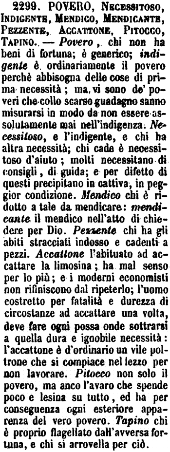 Povero, Necessitoso, Indigente, Mendico, Mendicante, Pezzente, Accattone, Pitocco, Tapino - Povero, chi non ha beni di fortuna; è generico; indigente è ordinariamente il povero perchè abbisogna delle cose di prima necessità; ma vi sono de' poveri che collo scarso guadagno sanno misurarsi in modo da non essere assolutamente mai nell'indigenza. Necessitoso, e l'indigente, e chi ha altra necessità; chi cade è necessitoso d'aiuto; molti necessitano di consigli, di guida; e per difetto di questi precipitano in cattiva, in peggior condizione. Mendico chi è ridotto a tale da mendicare: mendicante il mendico nell'atto di chiedere per Dio. Pezzente chi ha gli abiti stracciati indosso e cadenti a pezzi. Accattone l'abituato ad accattare la limosina; ha mal senso per lo più; e i moderni economisti non rifiniscono dal ripeterlo; l'uomo costretto per fatalità e durezza di circostanze ad accattare una volta, deve fare ogni possa onde sottrarsi a quella dura e ignobile necessità: l'accattone è d'ordinario un vile poltrone che si compiace nel lezzo per non lavorare. Pitocco non solo il povero, ma anco l'avaro che spende poco e lesina su tutto, ed ha per conseguenza ogni esteriore apparenza del vero povero. Tapino chi è proprio flagellato dall'avversa fortuna, e chi si arrovella per ciò. [immagine]