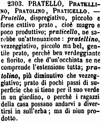 | Pratello, Pratellino, Pratolino, Praticello - Pratello, dispregiativo, piccolo e forse cattivo prato, cioè magro e poco produttivo; praticello, ne sarebbe un'attenuazione: pratellino, vezzeggiativo, piccolo ma bel, gentile prato, perché ben verdeggiante e fiorito, e che d'un'occhiata se ne comprende l'estensione tutta; pratolino, più diminutivo che vezzeggiativo; prato di pochi passi di superficie che si tiene per il suo verde in un giardino, o perché i ragazzi della casa possano andarvi a divertirsi in sull'erba; ma di niun prodotto. [immagine] |