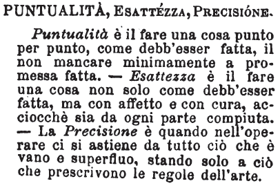 | Puntualità, Esattezza, Precisione - Puntualità è il fare una cosa punto per punto, come debb'esser fatta, il non mancare minimamente a promessa fatta. - Esattezza è il fare una cosa non solo come debb'esser fatta, ma con affetto e con cura, acciocchè sia da ogni parte compiuta. - La Precisione è quando nell'operare ci si astiene da tutto ciò che è vano e superfluo, stando solo a ciò che prescrivono le regole dell'arte. [immagine] |