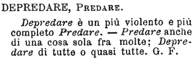 Depredare, Predare - Depredare è un più violento e più completo Predare.-Predare anche di una cosa sola fra molte; Depredare di tutte o quasi tutte. G. F. [immagine]