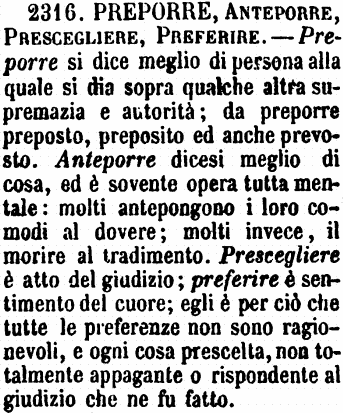 | Preporre, Anteporre, Prescegliere, Preferire - Preporre si dice meglio di persona alla quale si dia sopra qualche altra supremazia e autorità; da preporre preposto, preposito ed anche prevosto. Anteporre dicesi meglio di cosa, ed è sovente opera tutta mentale: molti antepongono i loro comodi al dovere; molti invece, il morire al tradimento. Prescegliere è atto del giudizio; preferire è sentimento del cuore; egli è per ciò che tutte le preferenze non sono ragionevoli, e ogni cosa prescelta, non totalmente appagante o rispondente al giudizio che ne fu fatto. [immagine] |