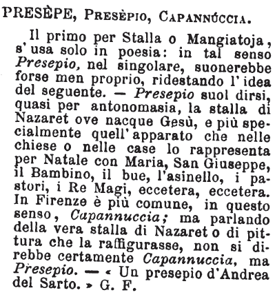 Presepe, Presepio, Capannuccia - Il primo per Stalla o Mangiatoja, s'usa solo in poesia: in tal senso Presepio, nel singolare, suonerebbe forse men proprio, ridestando l'idea del seguente. - Presepio suol dirsi, quasi per antonomasia, la stalla di Nazaret ove nacque Gesù, e più specialmente quell'apparato che nelle chiese o nelle case lo rappresenta per Natale con Maria, San Giuseppe, il Bambino, il bue, l'asinello, i pastori, i Re Magi, eccetera, eccetera. In Firenze è più comune, in questo senso, Capannuccia; ma parlando della vera stalla di Nazaret o di pittura che la raffigurasse, non si direbbe certamente Capannuccia, ma Presepio. - «Un presepio d'Andrea del Sarto.» G. F. [immagine]