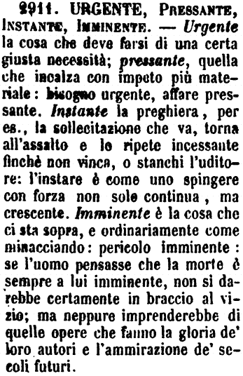 Urgente, Pressante, Instante, Imminente - Urgente la cosa che deve farsi di una certa giusta necessità; pressante, quella che incalza con impeto più materiale: bisogno urgente, affare pressante. Instante la preghiera, per es., la sollecitazione che va, torna all'assalto e lo ripete incessante finchè non vinca, o stanchi l'uditore: l'instare è come uno spingere con forza non solo continua, ma crescente. Imminente è la cosa che ci sta sopra, e ordinariamente come minacciando: pericolo imminente: se l'uomo pensasse che la morte è sempre a lui imminente, non si darebbe certamente in braccio al vizio; ma neppure imprenderebbe di quelle opere che fanno la gloria de' loro autori e l'ammirazione de' secoli futuri. [immagine]