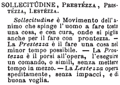 Sollecitudine, Prestezza, Prontezza, Lestezza - Sollecitudine è Movimento dell'animo che spinge l'uomo a fare tosto una cosa, e con cura, onde si piglia anche per il fare con prontezza. - La Prestezza è il fare una cosa nel minor tempo possibile. - La Prontezza è il porsi all'opera, l'eseguire un comando, o simili, senza mettere tempo in mezzo. - La Lestezza opera speditamente, senza impacci, e di buona voglia. [immagine]