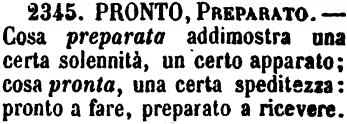 | Pronto, Preparato - Cosa preparata addimostra una certa solennità, un certo apparato; cosa pronta, una certa speditezza: pronto a fare, preparato a ricevere. [immagine] |