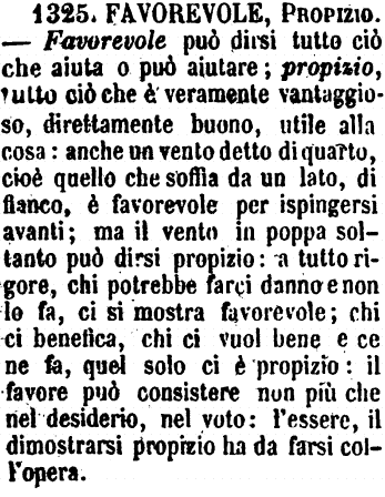 Favorevole, Propizio - Favorevole può dirsi tutto ciò che aiuta o può aiutare; propizio, tutto ciò che è veramente vantaggioso, direttamente buono, utile alla cosa: anche un vento detto di quarto, cioè quello che soffia da un lato, di fianco, è favorevole per ispingersi avanti; ma il vento in poppa soltanto può dirsi propizio: a tutto rigore, chi potrebbe farci danno e non lo fa, ci si mostra favorevole; chi ci benefica, chi ci vuol bene e ce ne fa, quel solo ci è propizio: il favore può consistere non più che nel desiderio, nel voto: l'essere, il dimostrarsi propizio ha da farsi coll'opera. [immagine]