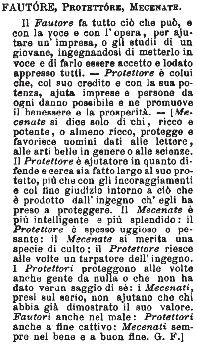 | Fautore, Protettore, Mecenate - Il Fautore fa tutto ciò che può, e con la voce e con l'opera, per ajutare un'impresa, o gli studii di un giovane, ingegnandosi di metterlo in voce e di farlo essere accetto e lodato appresso tutti. - Protettore è colui che, col suo credito e con la sua potenza, ajuta imprese e persone da ogni danno possibile e ne promuove il benessere e la prosperità. - [Mecenate si dice solo di chi, ricco e potente, o almeno ricco, protegge e favorisce uomini dati alle lettere, alle arti belle in genere o alle scienze. Il Protettore è ajutatore in quanto difende e cerca sia fatto largo al suo protetto, più che con gli incoraggiamenti e col fine giudizio intorno a ciò che è prodotto dall'ingegno ch'egli ha preso a proteggere. Il Mecenate è più intelligente e più splendido: il Protettore è spesso uggioso e pesante: il Mecenate si merita una specie di culto; il Protettore riesce alle volte un tarpatore dell'ingegno. I Protettori proteggono alle volte anche gente da nulla o che non ha dato verun saggio di sè: i Mecenati, presi sul serio, non ajutano che chi abbia già dimostrato il suo valore. Fautori anche nel male: Protettori anche a fine cattivo: Mecenati sempre nel bene e a buon fine. G.F.] [immagine] |