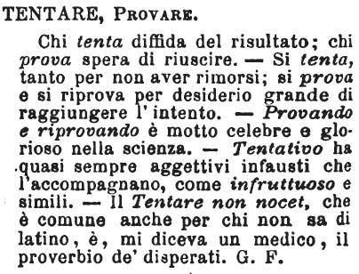 Tentare, Provare - Chi tenta diffida del risultato: chi prova spera di riuscire. - Si tenta, tanto per non aver rimorsi; si prova e si riprova per desiderio grande di raggiungere l'intento. - Provando e riprovando è motto celebre e glorioso nella scienza. - Tentativo ha quasi sempre aggettivi infausti che l'accompagnano, come infruttuoso e simili. - Il Tentare non nocet, che è comune anche per chi non sa di latino, è, mi diceva un medico, il proverbio de' disperati. G.F. [immagine]